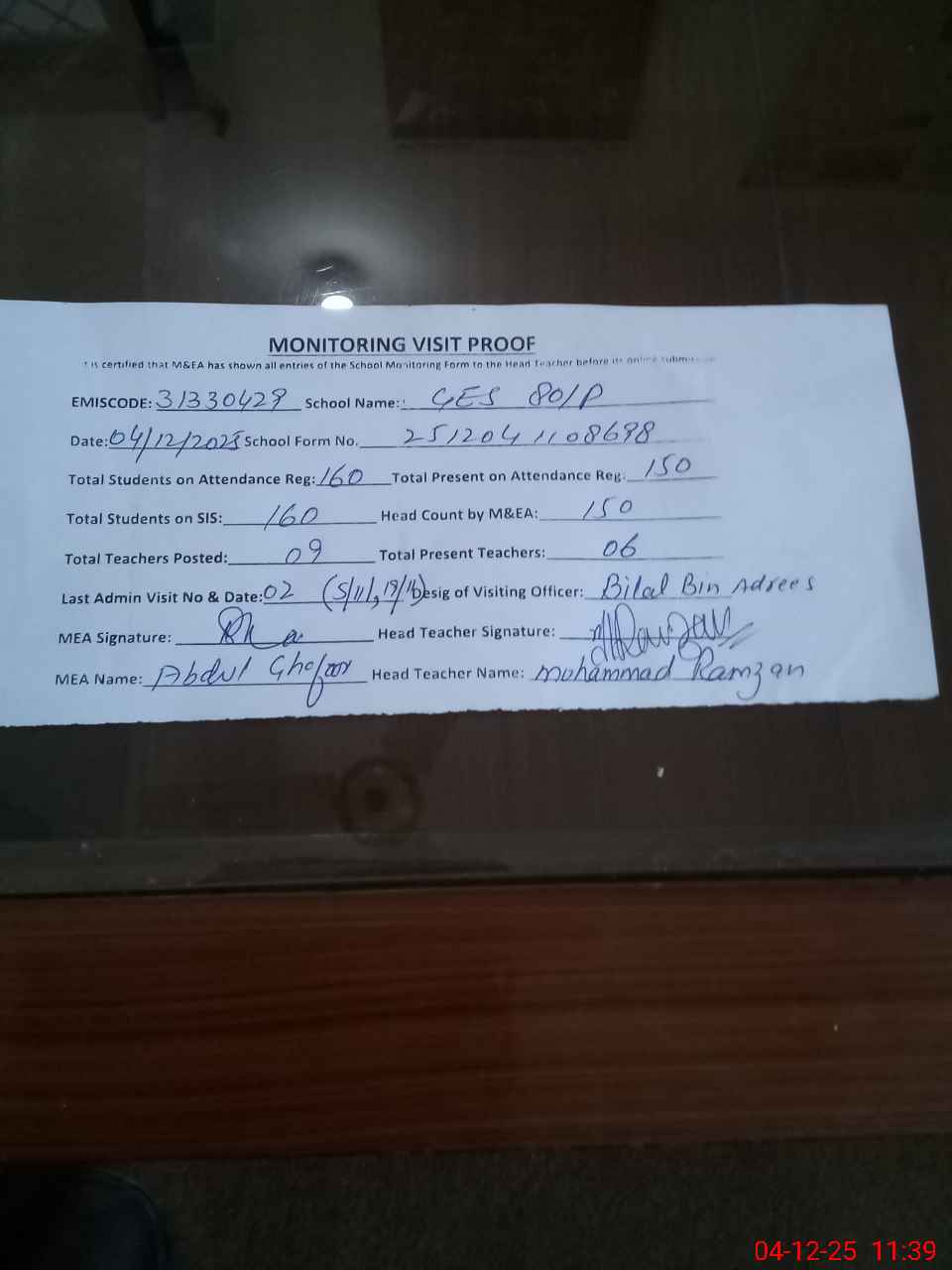 | Attendance Register | Head Teacher | MEA with School | Visit Proof |