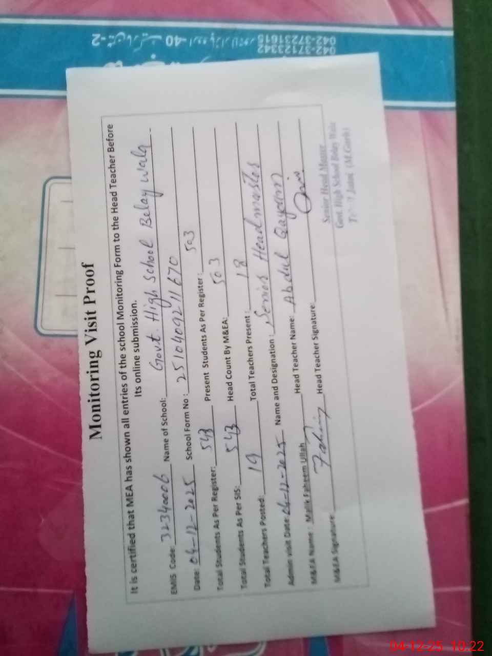 | Attendance Register | Head Teacher | MEA with School | Visit Proof |
