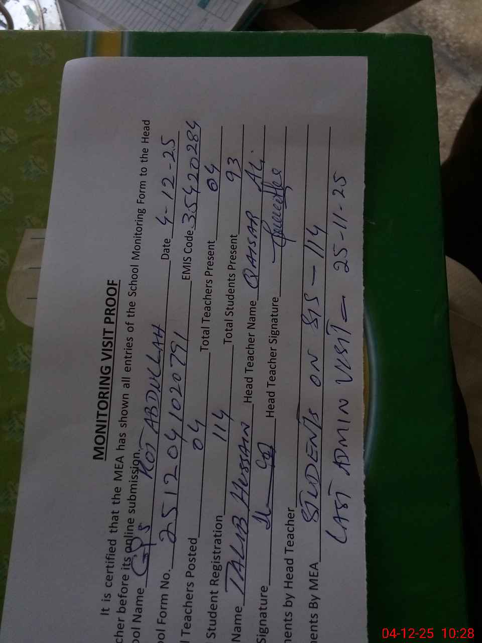 | Attendance Register | Head Teacher | MEA with School | Visit Proof |