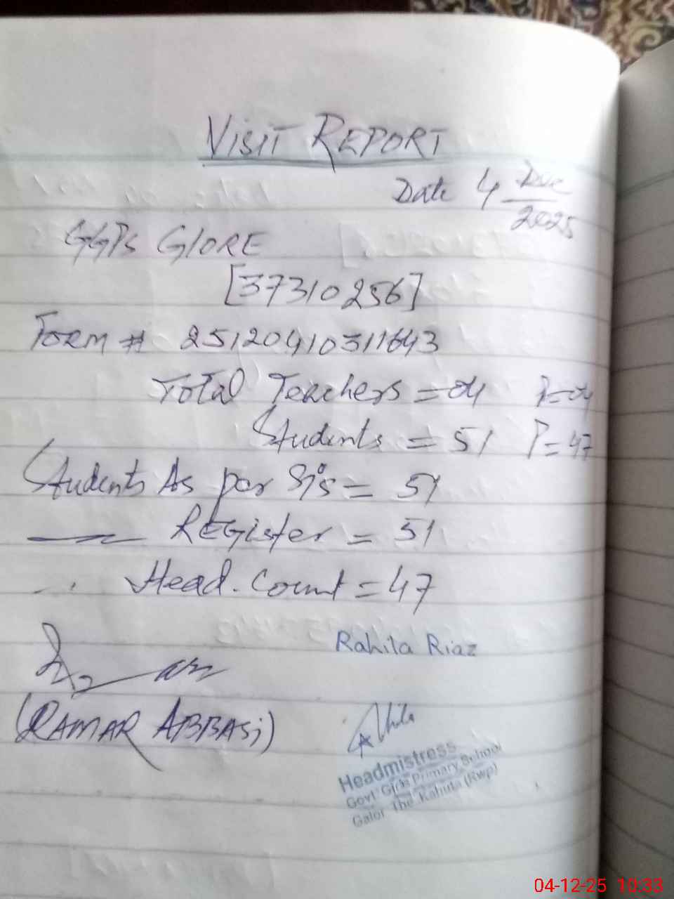 | Attendance Register | Head Teacher | MEA with School | Visit Proof |