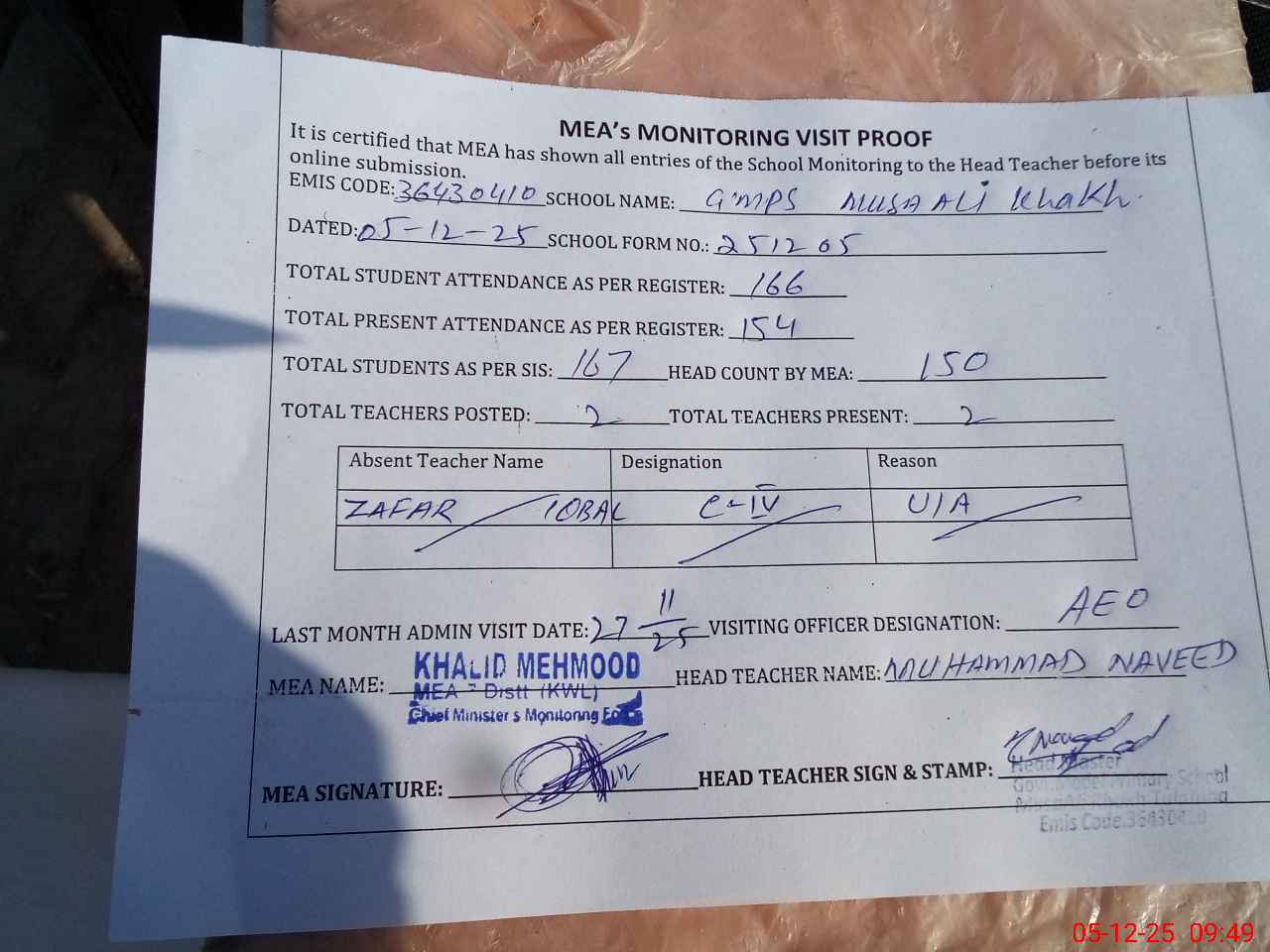 | Attendance Register | Head Teacher | MEA with School | Visit Proof |