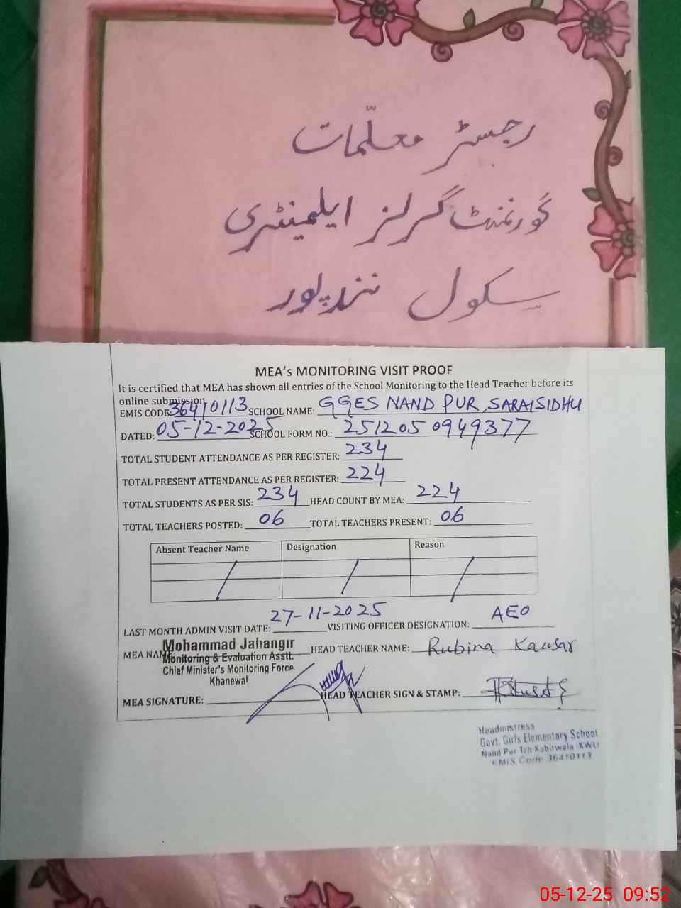 | Attendance Register | Head Teacher | MEA with School | Visit Proof |