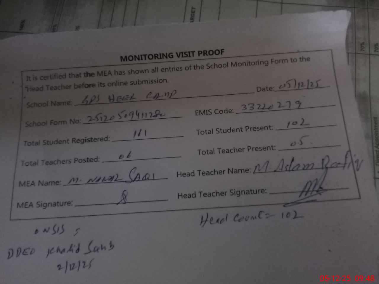 | Attendance Register | Head Teacher | MEA with School | Visit Proof |