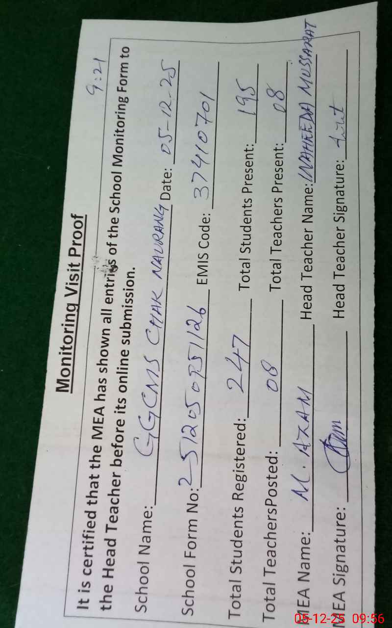 | EMIS Code: 37410701 | Name of School: GGCMS CHAK NAURAG | |||