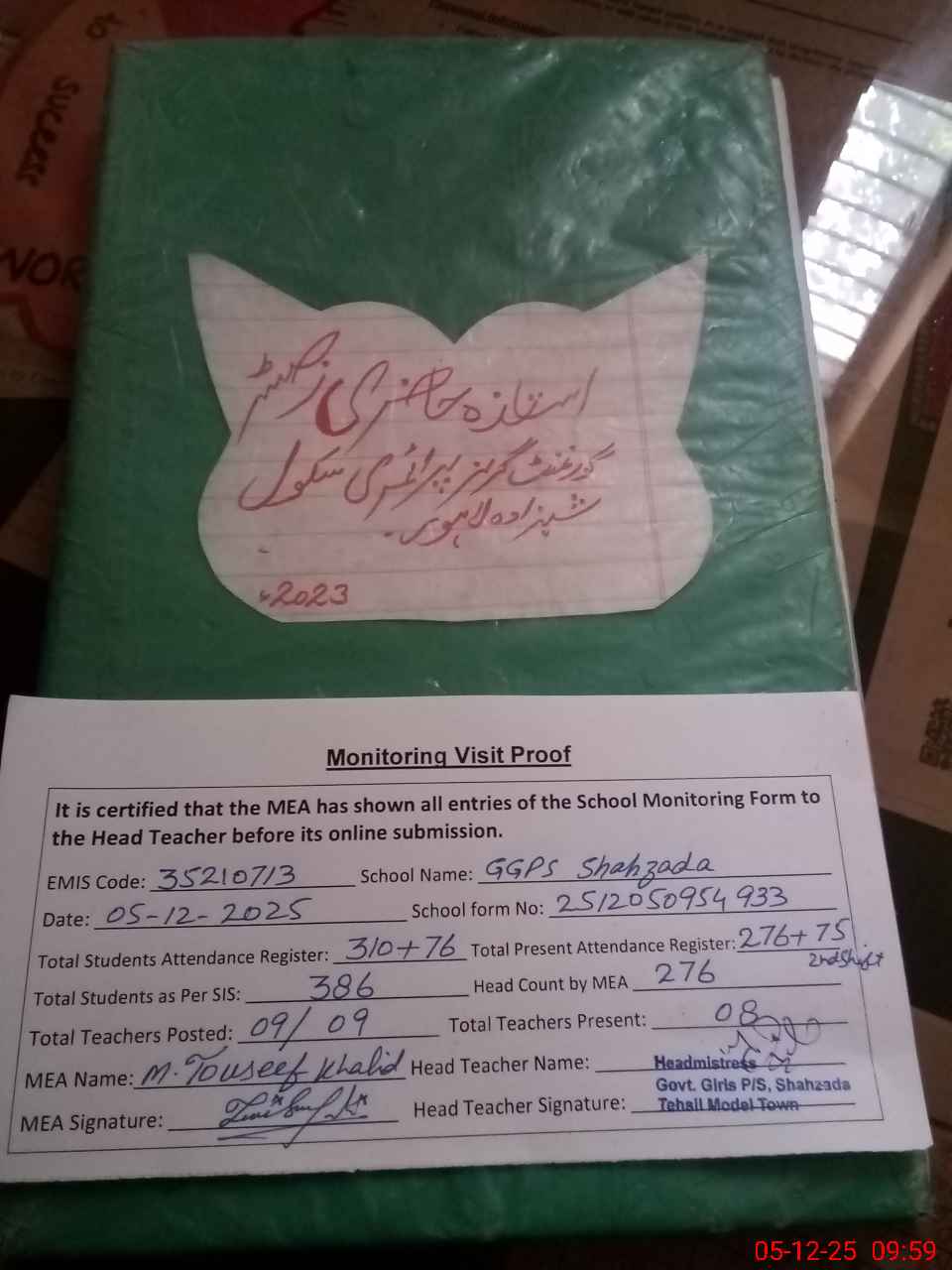 | Attendance Register | Head Teacher | MEA with School | Visit Proof |