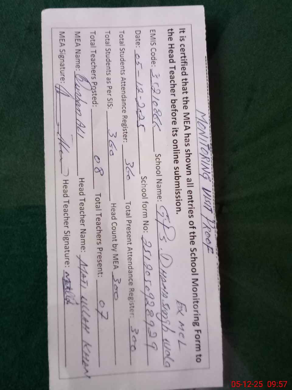 | Attendance Register | Head Teacher | MEA with School | Visit Proof |