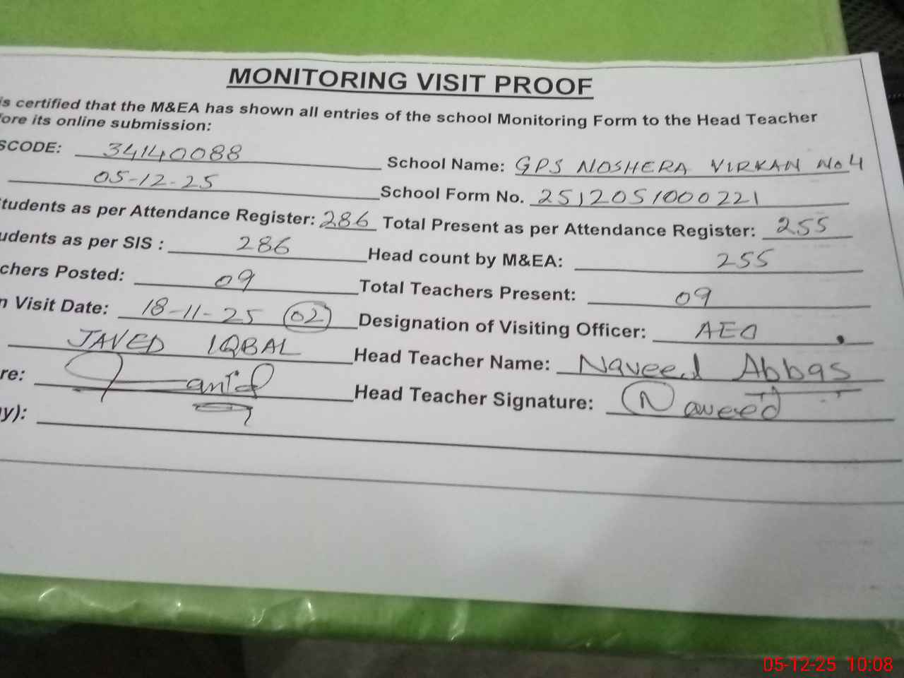 | Attendance Register | Head Teacher | MEA with School | Visit Proof |