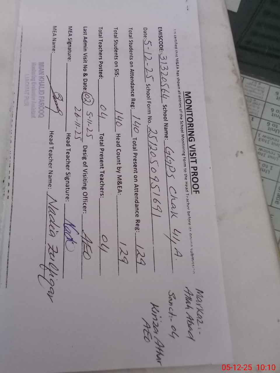 | Attendance Register | Head Teacher | MEA with School | Visit Proof |