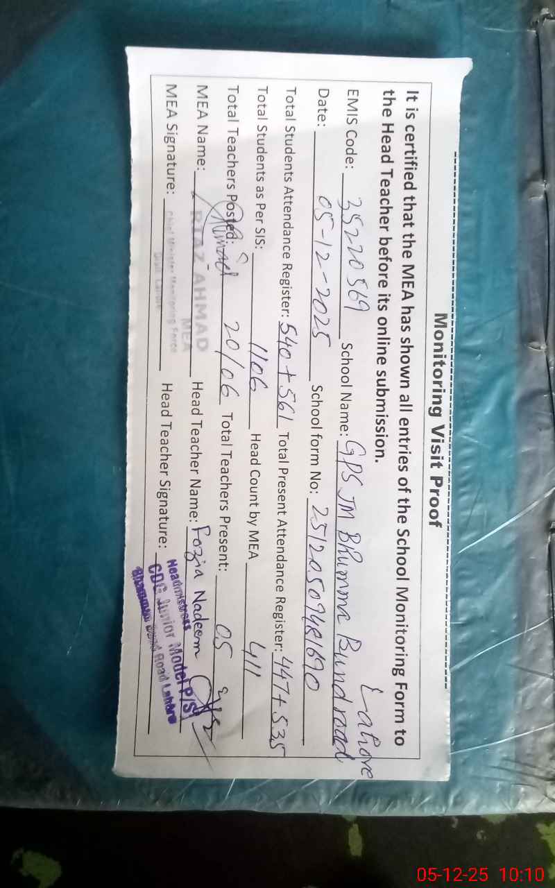 | EMIS Code: 35220569 | Name of School: GPS JUNIOR MODEL BHUMA BUND ROAD (EX-MCL) | |||
