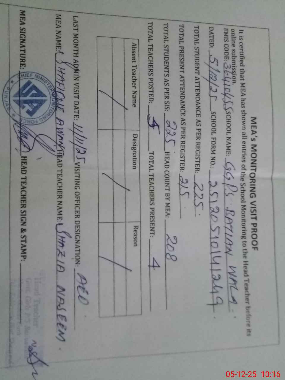 | Attendance Register | Head Teacher | MEA with School | Visit Proof |
