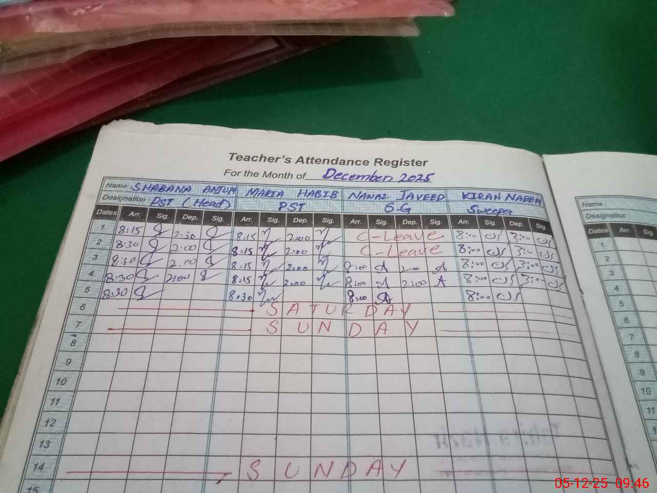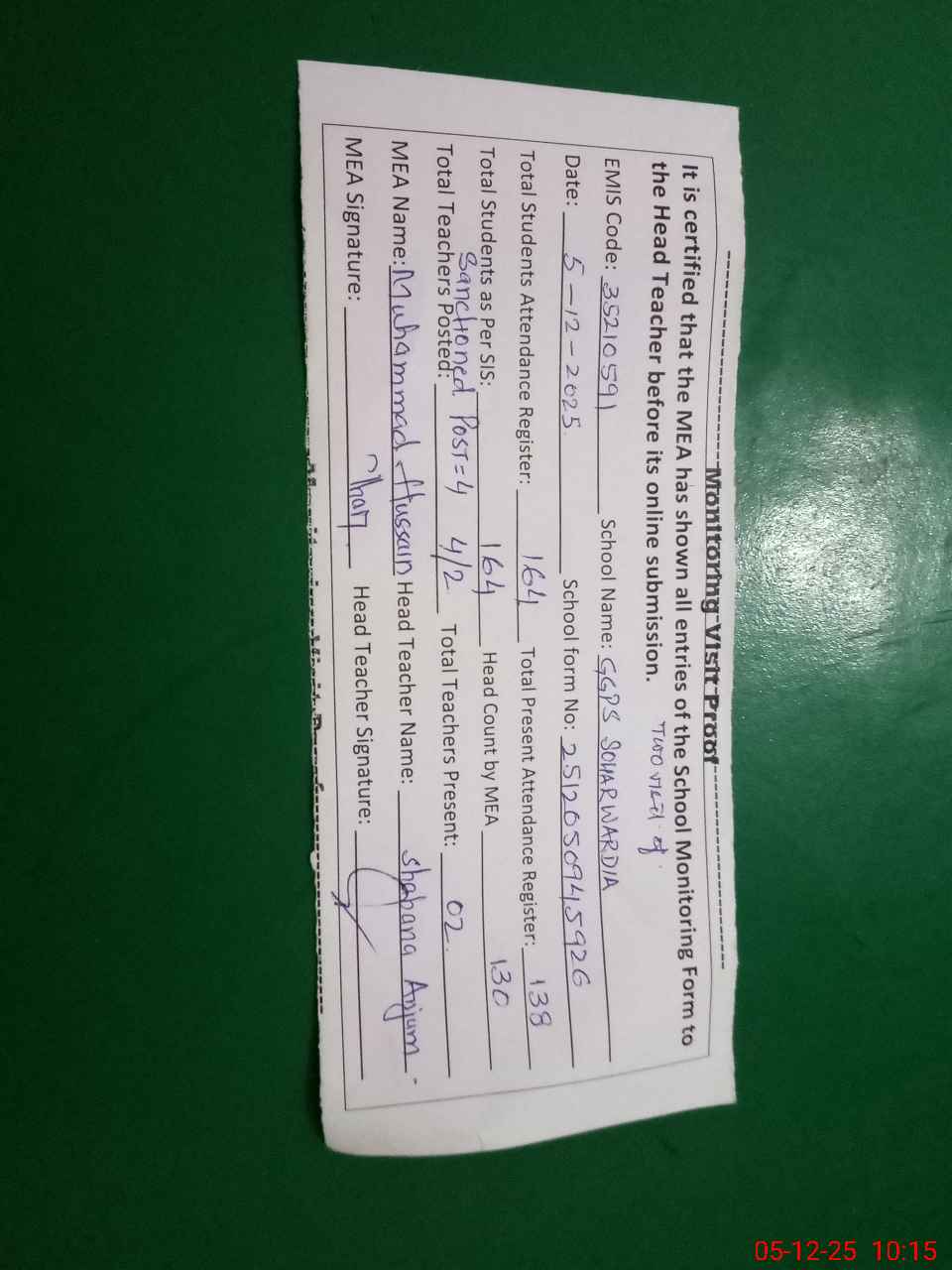 | Remarks (Use Separate Page if Required): 1 Rented building school and needs repair 2 No time table prepared for summer trimming 3 NSB data not up dated on sis from July 2025 to 30th November 2025 4 Shortages of students furniture in some classes four to five student sitting in single three seated bench 5 Two visit of AEO in the month of November 2025 dated 20-11-2025 and 27-11-2025 | |||||