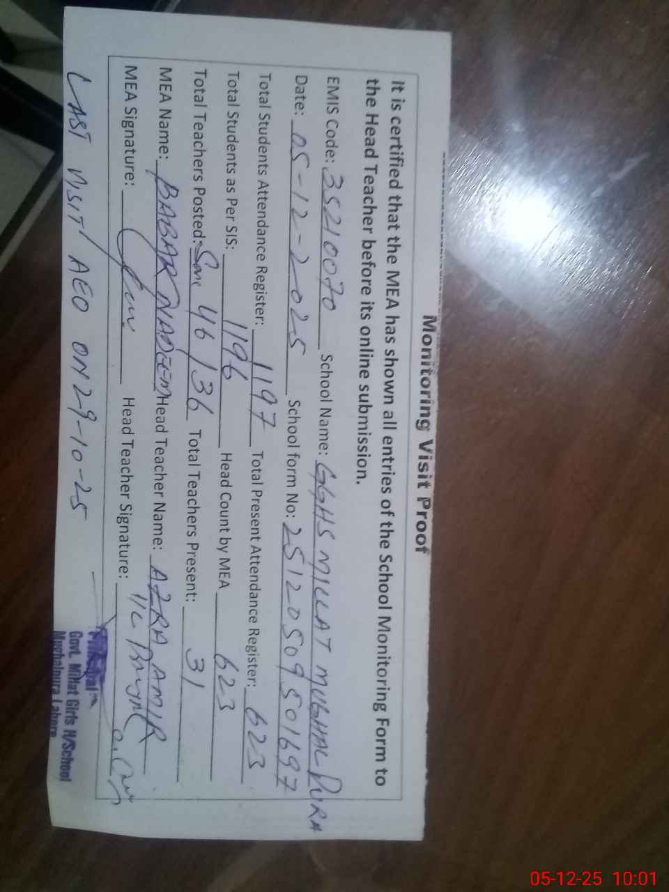 | Attendance Register | Head Teacher | MEA with School | Visit Proof |