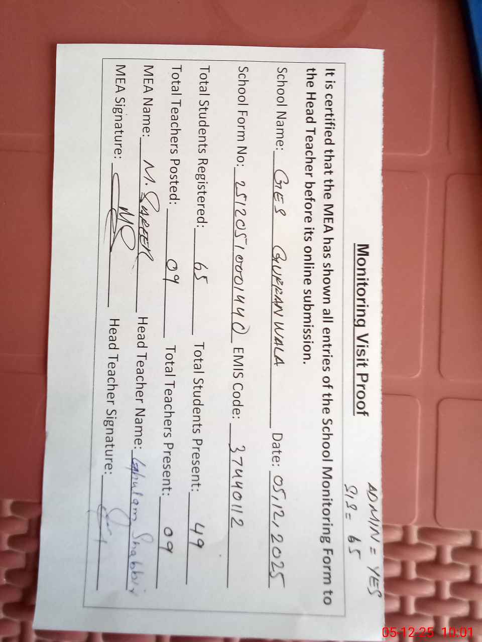 | Certified that this School was Inspected by the Undersigned MEA/DMO Today and the Information Stated Above is as Per Record. | |||||
