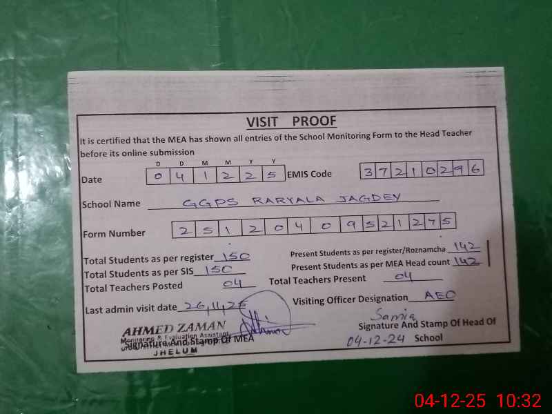 | Attendance Register | Head Teacher | MEA with School | Visit Proof |