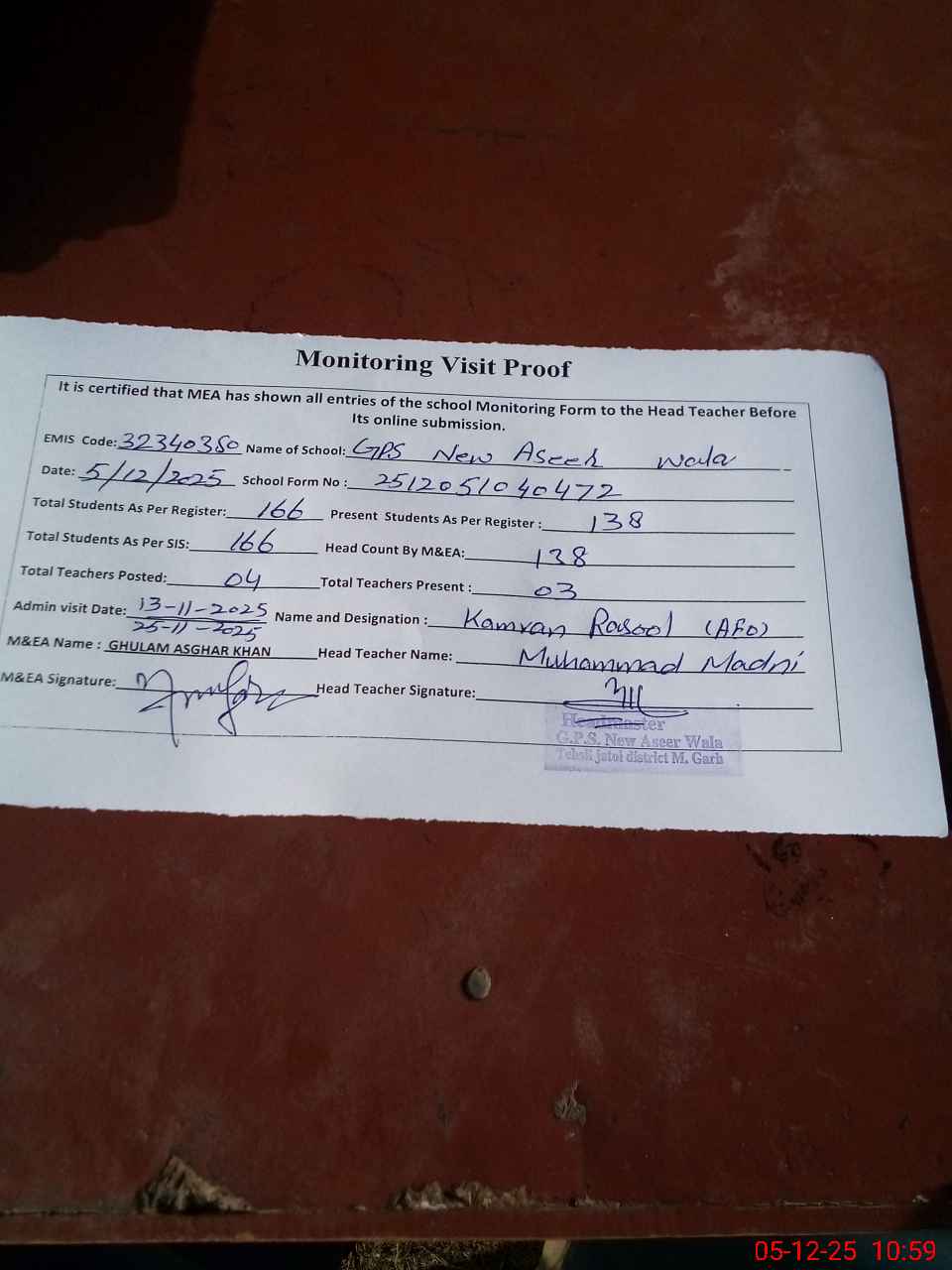| EMIS Code: 32340350 | Name of School: GPS NEW ASIR WALA | |||