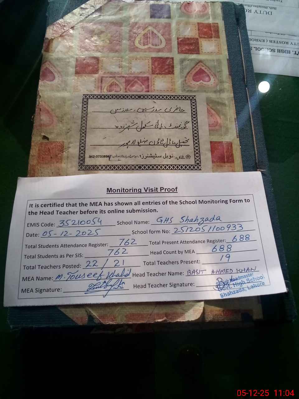 | Attendance Register | Head Teacher | MEA with School | Visit Proof |