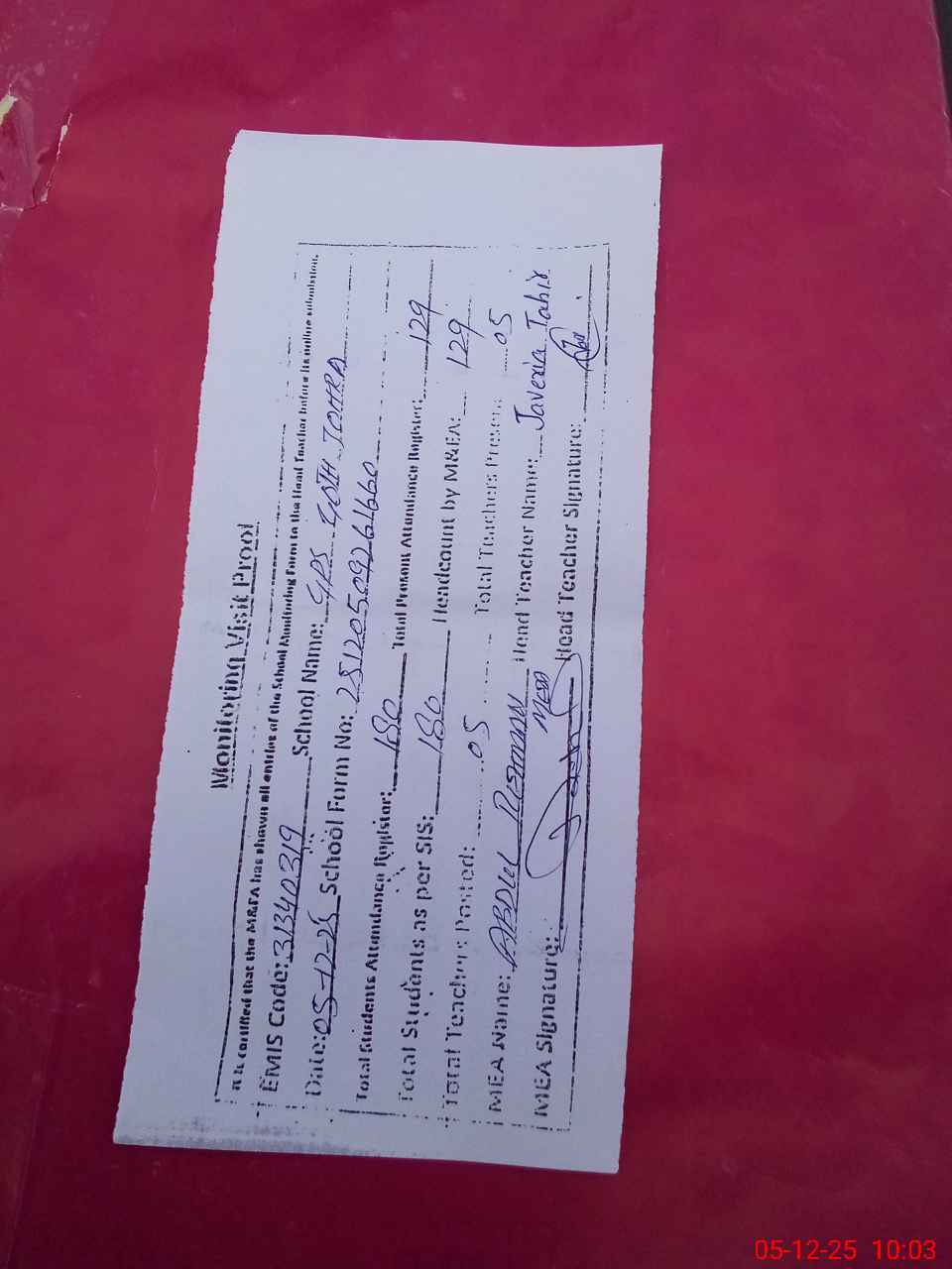| Attendance Register | Head Teacher | MEA with School | Visit Proof |