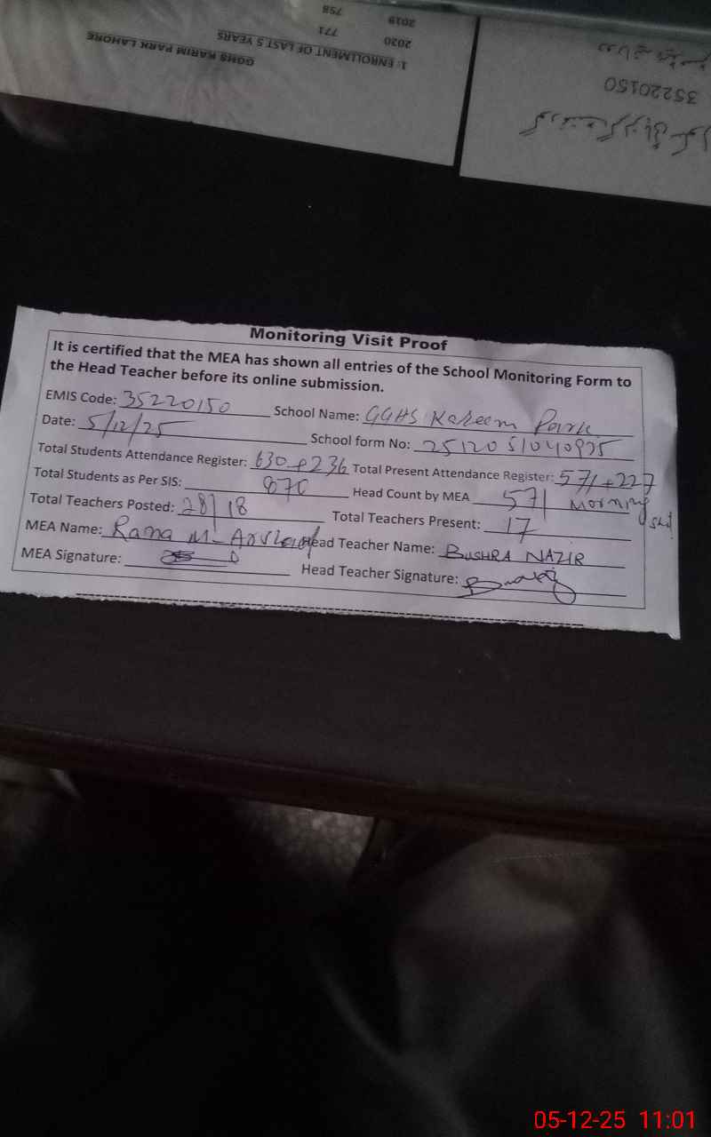 | EMIS Code: 35220150 | Name of School: GGHS KARIM PARK (Newly Upgraded) | |||