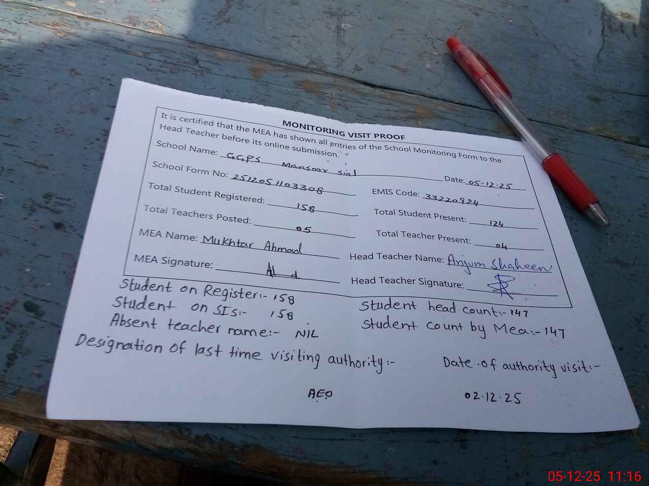 | Attendance Register | Head Teacher | MEA with School | Visit Proof |