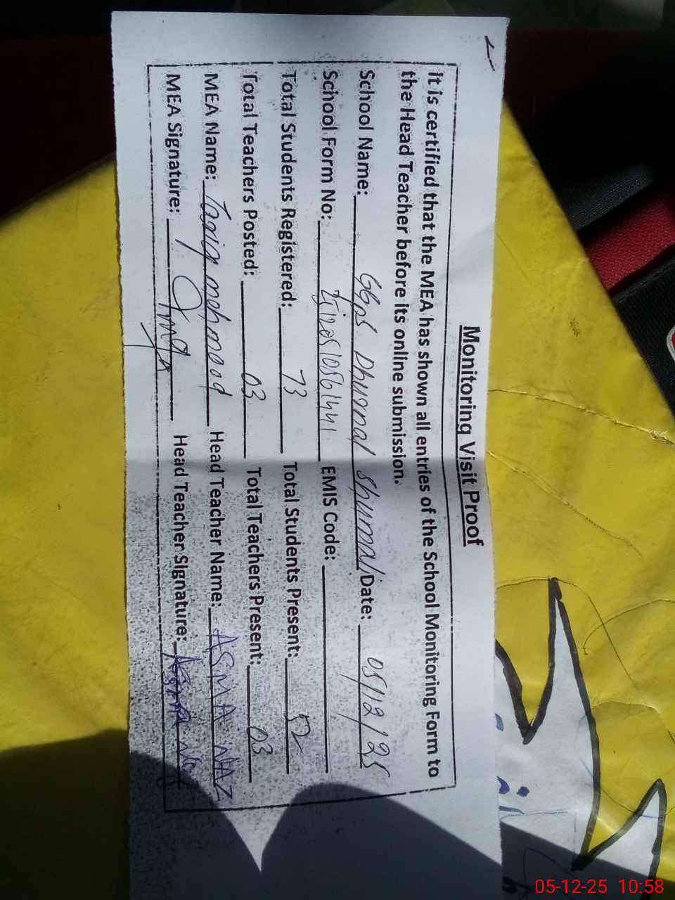 | Attendance Register | Head Teacher | MEA with School | Visit Proof |