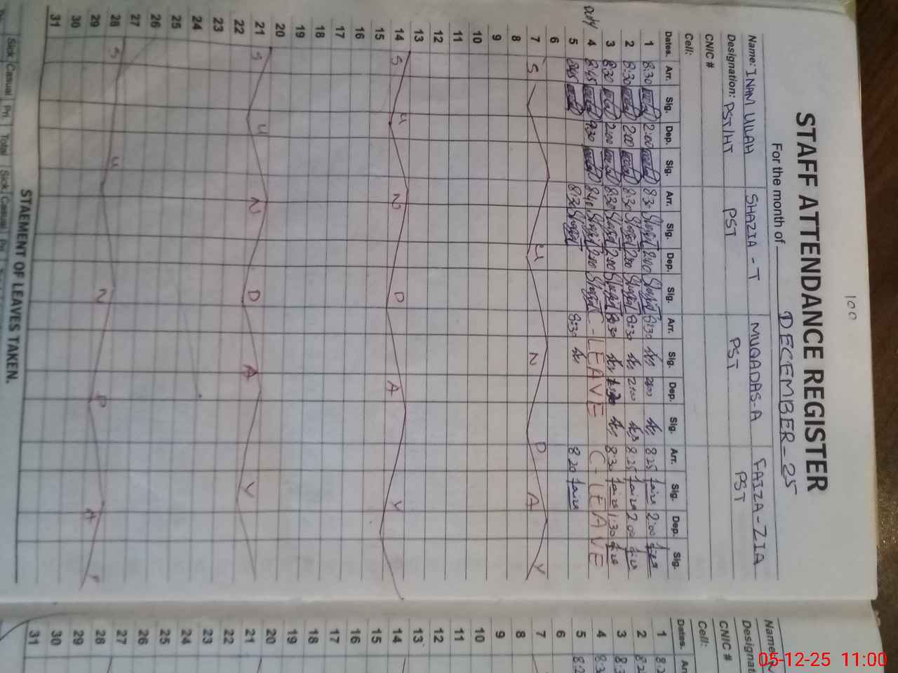 | CNIC | Full Name | Designation | R/C | Absence during last cal. month |