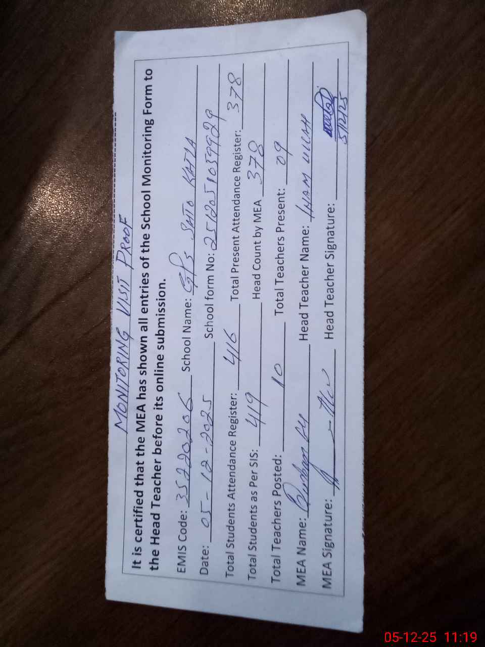 | Attendance Register | Head Teacher | MEA with School | Visit Proof |