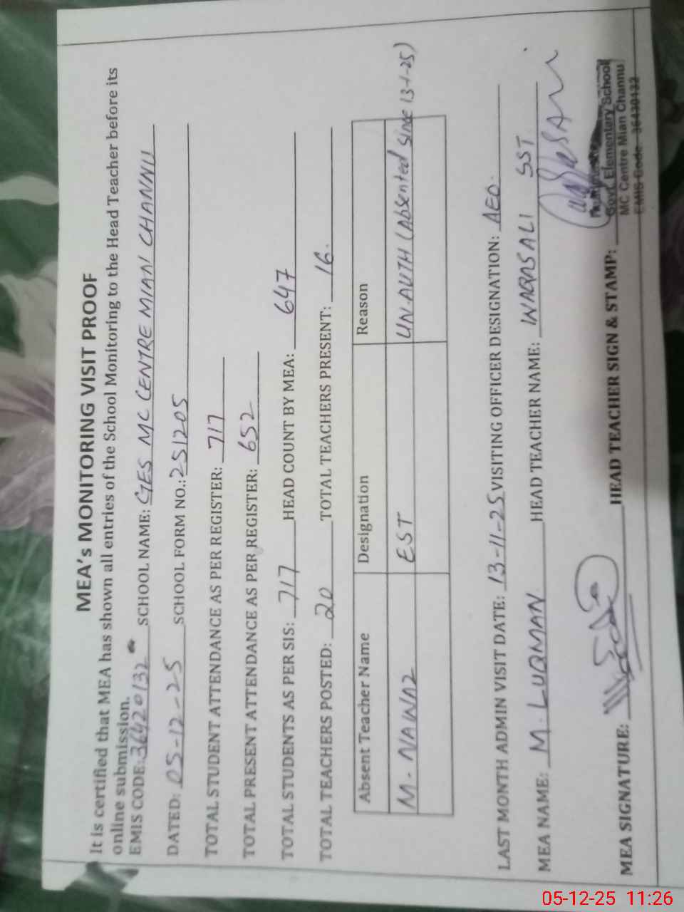 | Attendance Register | Head Teacher | MEA with School | Visit Proof |
