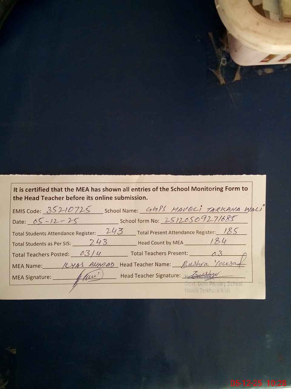| Attendance Register | Head Teacher | MEA with School | Visit Proof |