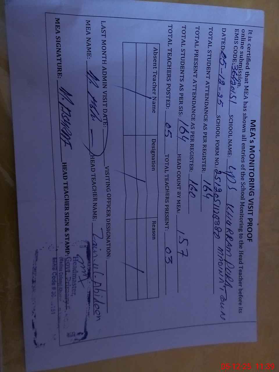 | Attendance Register | Head Teacher | MEA with School | Visit Proof |
