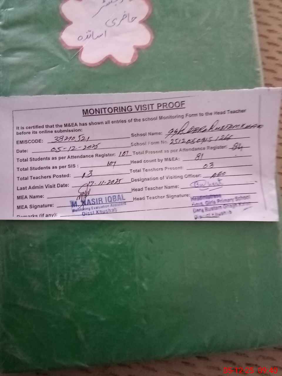 | Attendance Register | Head Teacher | MEA with School | Visit Proof |