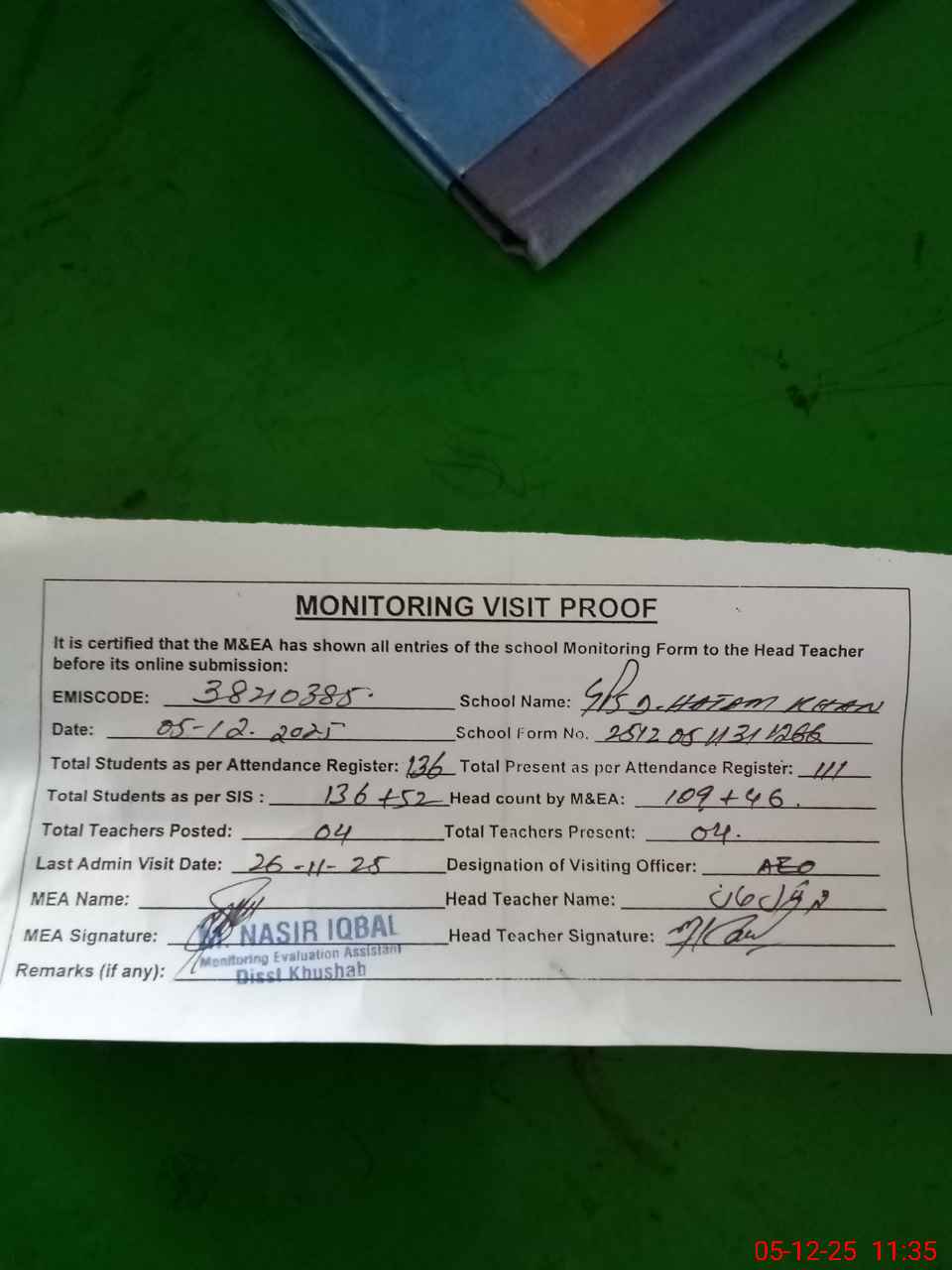 | Attendance Register | Head Teacher | MEA with School | Visit Proof |