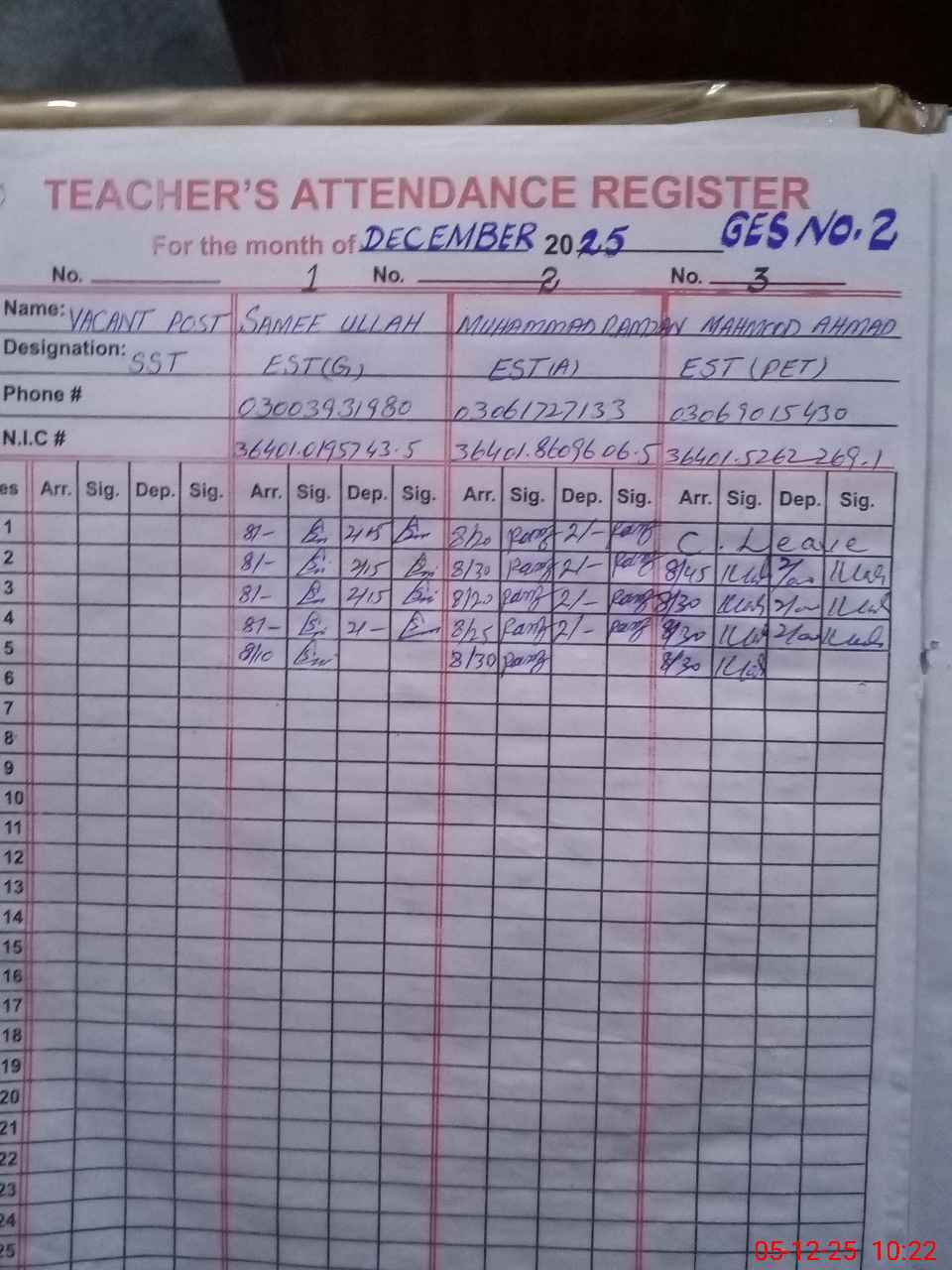 | CNIC | Full Name | Designation | R/C | Absence during last cal. month |