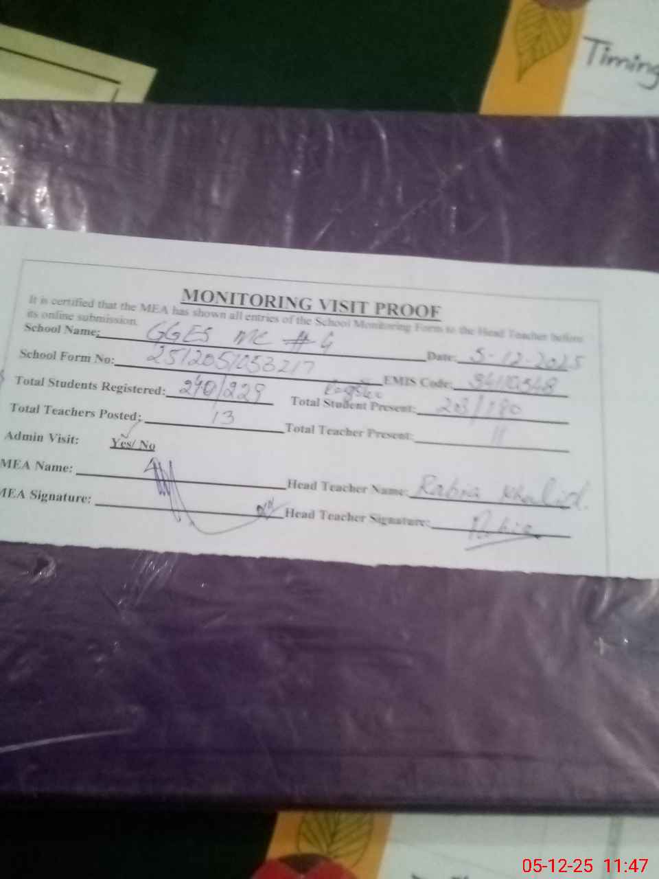 | Attendance Register | Head Teacher | MEA with School | Visit Proof |