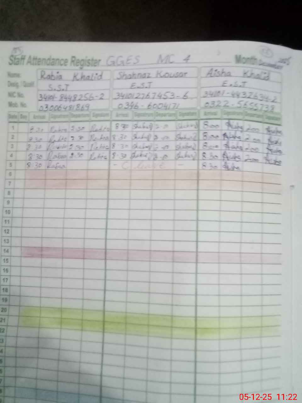 | CNIC | Full Name | Designation | R/C | Absence during last cal. month |