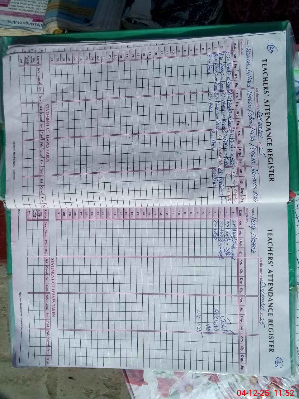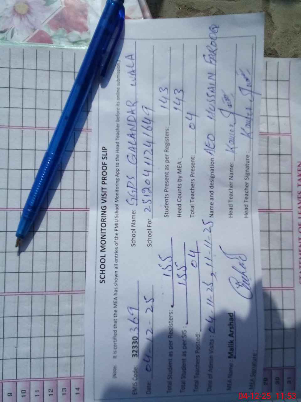 | Attendance Register | Head Teacher | MEA with School | Visit Proof |