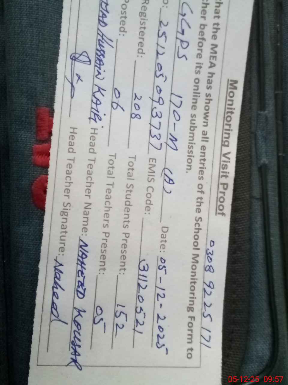 | Attendance Register | Head Teacher | MEA with School | Visit Proof |
