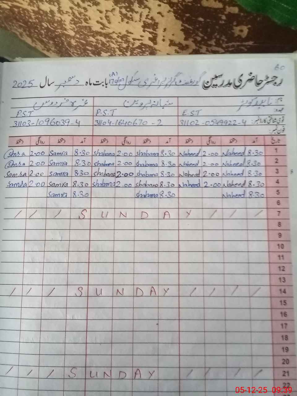 | CNIC | Full Name | Designation | R/C | Absence During Last Calender Month |