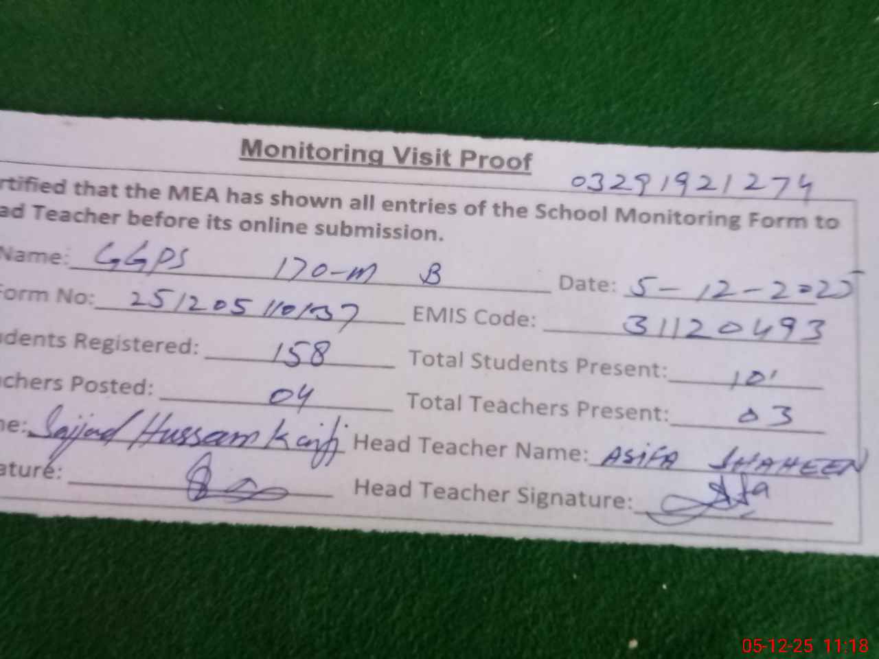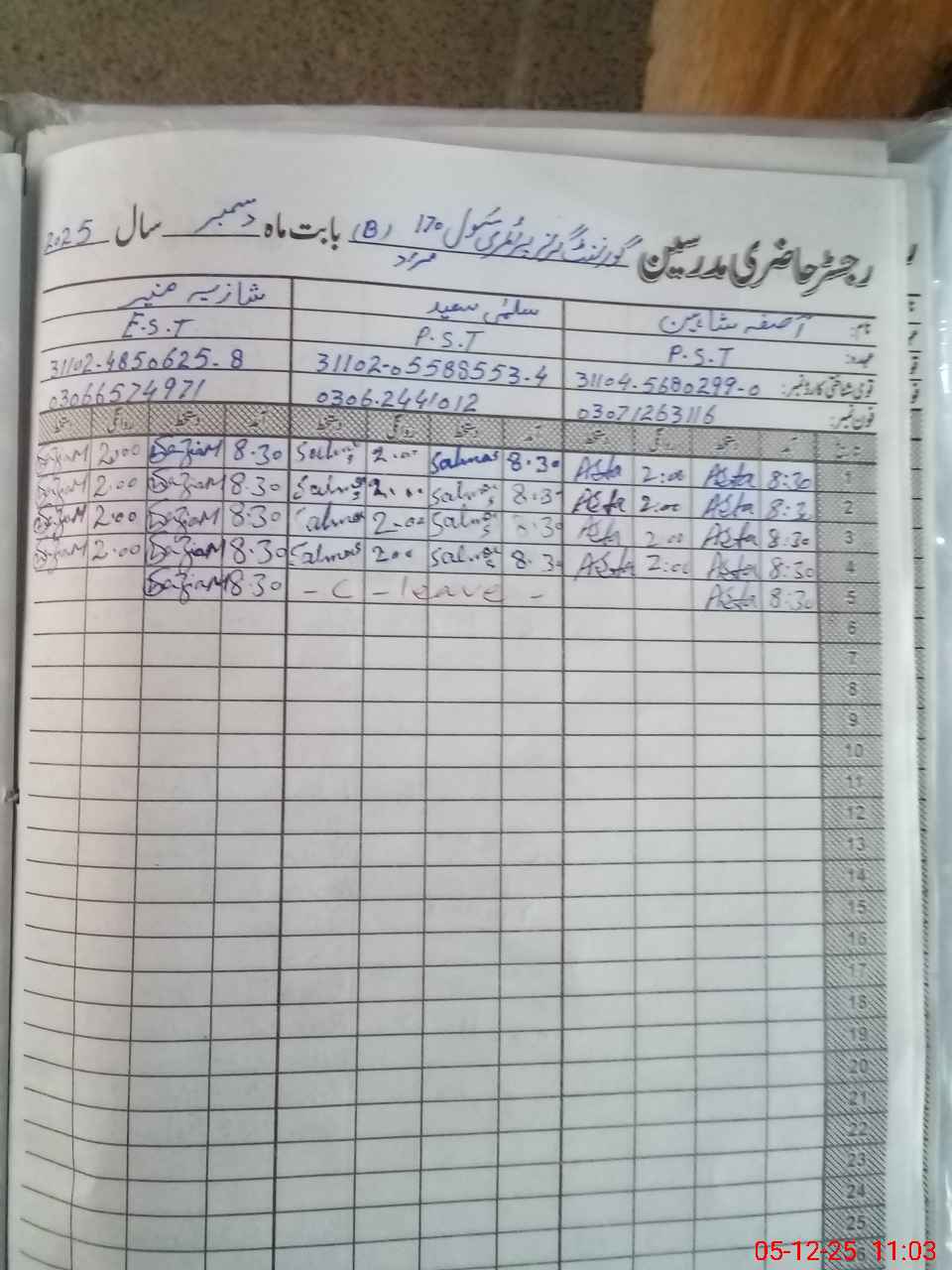 | Name: As**** Sh**** Designation: (School Headmaster's/Headmistress's) PST Phone/Cell Number: 03**** |