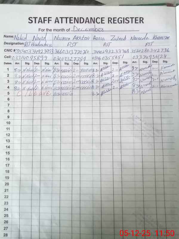 | Remarks (Use Separate Page if Required): NSB and FTF records not available as the head teacher is on leave Student count as per SIS is 315 but roznamcha shows 266 because this school recently abandoned afternoon classes which are still on record of SIS | |||||