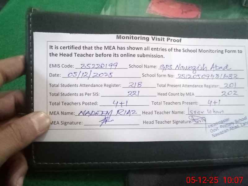 | EMIS Code: 35220199 | Name of School: GPS NAWAZISH ABAD RAIWIND ROAD | |||