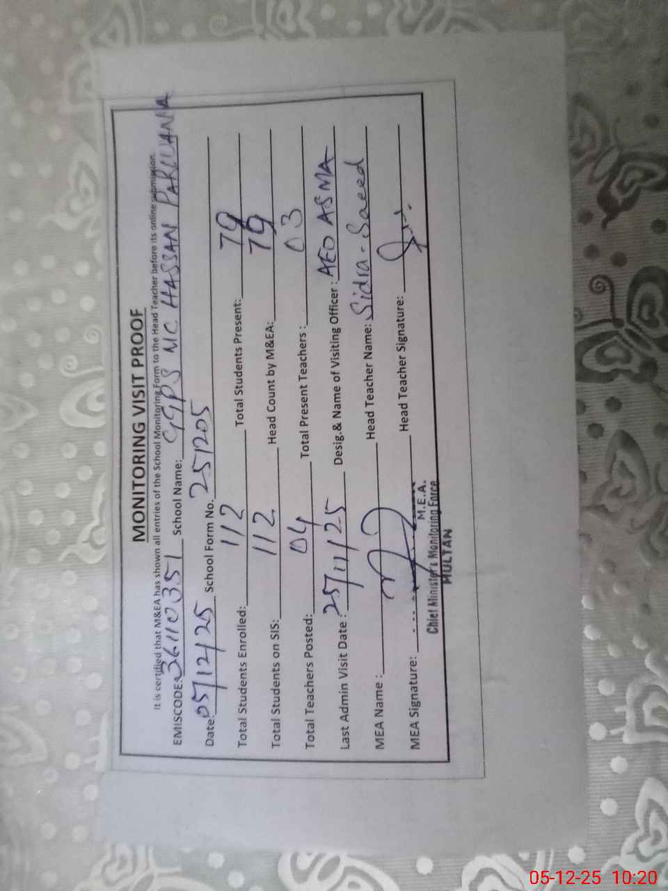 | EMIS Code: 36110351 | Name of School: GGPS MC HASSAN PARWANA | |||