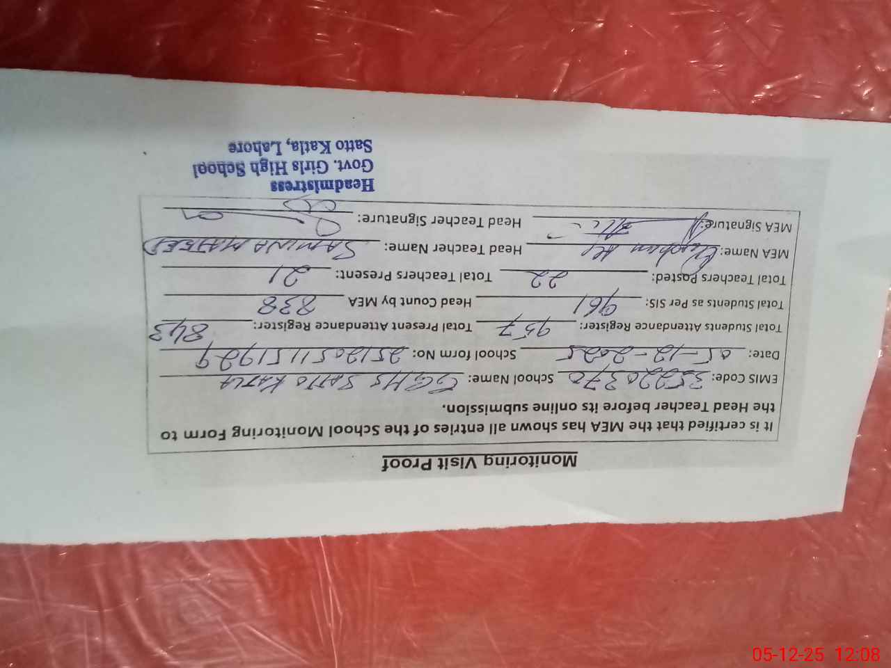 | Attendance Register | Head Teacher | MEA with School | Visit Proof |