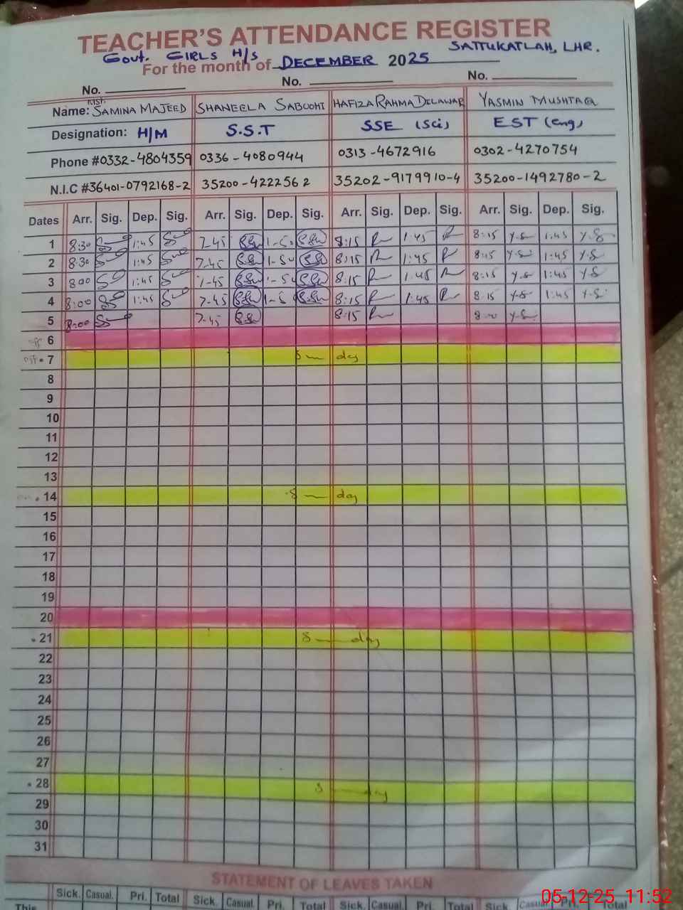 | CNIC | Full Name | Designation | R/C | Absence during last cal. month |