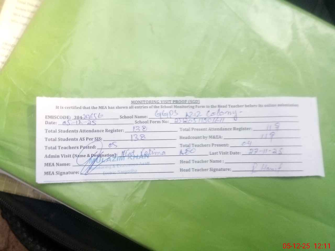 | EMIS Code: 38420656 | Name of School: GGPS AZIZ COLONY | |||