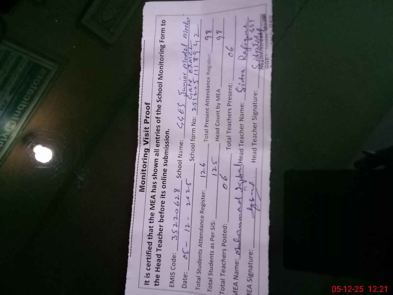 | Attendance Register | Head Teacher | MEA with School | Visit Proof |