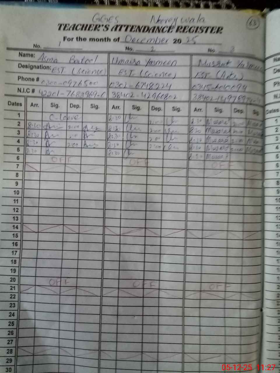 | CNIC | Full Name | Designation | R/C | Absence during last cal. month |