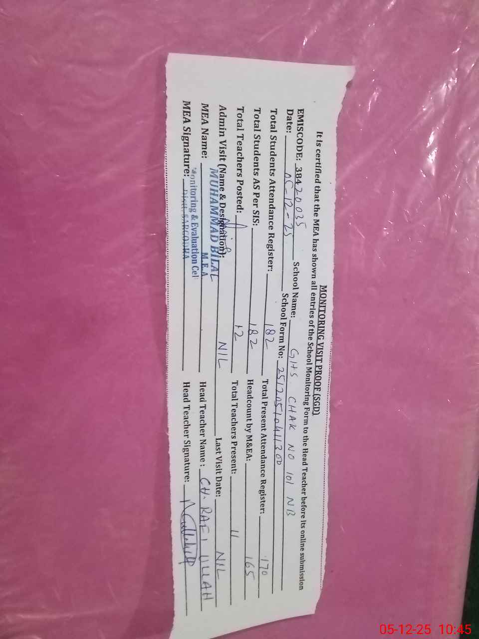 | EMIS Code: 38420035 | Name of School: GHS CHAK NO.101 NB SGD | |||