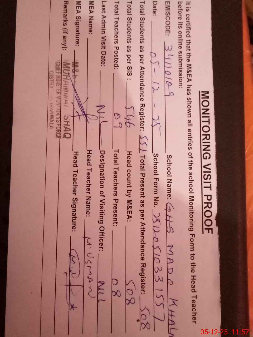 | Attendance Register | Head Teacher | MEA with School | Visit Proof |