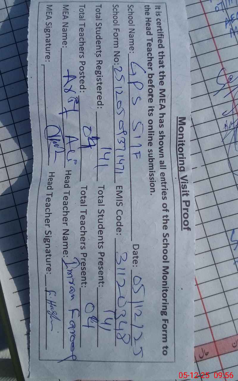 | Attendance Register | Head Teacher | MEA with School | Visit Proof |