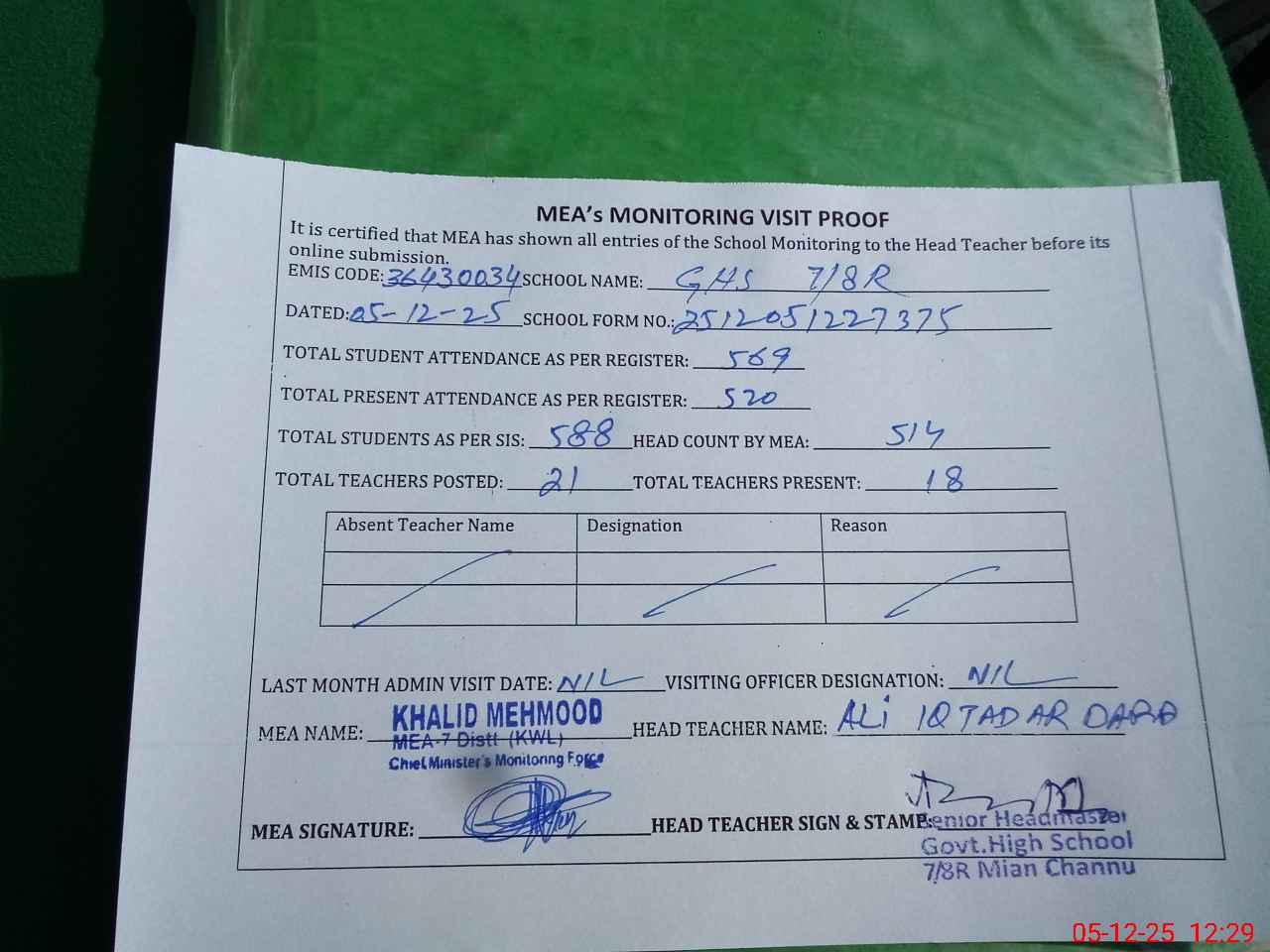 | Attendance Register | Head Teacher | MEA with School | Visit Proof |